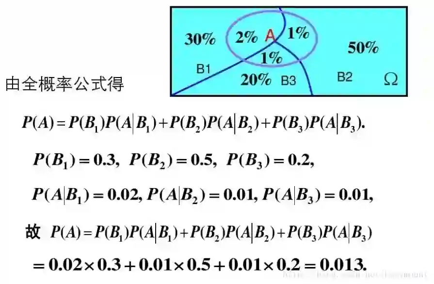 设Ω为试验E的样本空间,A为E的事件,如果有k个互斥且有穷个事件,即B1、B2、....、Bk为Ω的一个划分,且P(B1)+P(B2)+...+P(Bk)=1,P(Bi)>0(i=1,2,...,k),则: