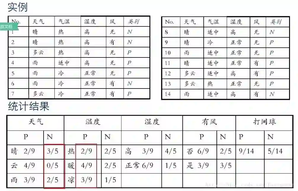 假设存在14天的天气情况和是否能打网球,包括天气、气温、湿度、风等,现在给出新的一天天气情况,需要判断我们这一天可以打网球吗?首先统计出各种天气情况下打网球的概率,如下图所示。