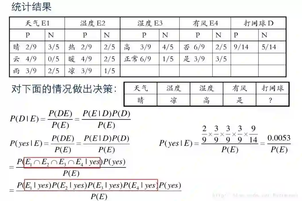 接下来是分析过程,其中包括打网球yse和不打网球no的计算方法。