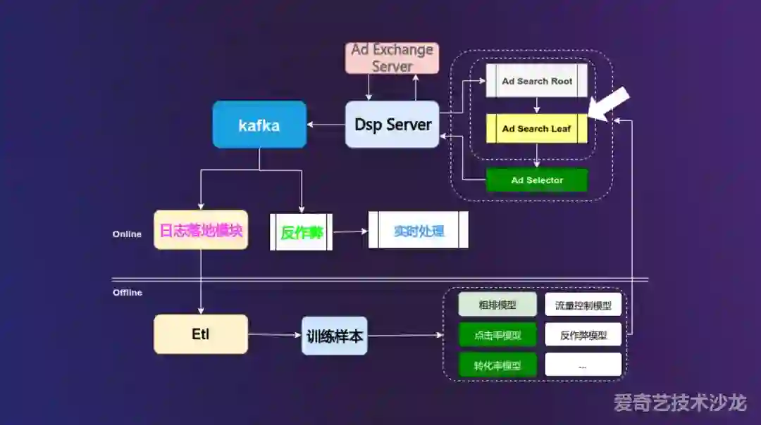 流量从 ADX 发送给 DSP 端,DSP 拿到流量之后交给检索召回模块,我们叫 Ad Search 模块,Ad Search 模块分为两个部分,一个是 Ad Search Root 模块,对流量进行识别,判断其为哪种类型的流量,比如 keyword 流量、信息流流量、banner 流量,然后交给不同级别的 Ad Search Leaf 模块对广告进行召回,选出相匹配的广告初步候选集,该模块就是我们今天的主题。然后将选出的广告初步候选集交给 Ad Selector 模块进行精排,即对广告的 CTR 或者 CVR 预估,进行打分,选出 top K 个广告返回给 DSP Server。同时 DSP Server 会将点击、曝光、后续的日志写入 kafka,并进行日志落地,日志落地后会进入后续的 ETL 离线流程,用于后续粗排、点击率等模型生成训练样本使用,另一部实时数据日志数据流会经过反作弊模块后过一遍 ctr 预估的 online learning 和实时曝光反馈的 online feedback。