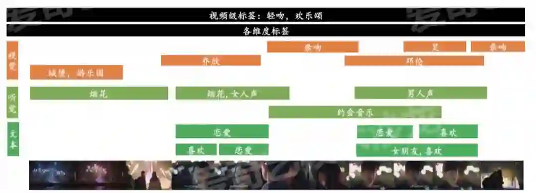 怎么实现对视频更进一步的理解,以下面的例子为主,我们可以从视觉、听觉、文本打各式各样的标签,也可以从部分到整体可以打上各种标签;有了这些底层标签之后,我们需要能达到满足2个需求: