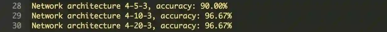 我们为隐藏层中的神经元数目选择三个值:5,10和20,得到(4-5-3),(4-10-3)和(4-20-3)的网络大小。 这意味着,例如(4-5-3)将有4个输入神经元,5个“隐藏”神经元和3个输出神经元。