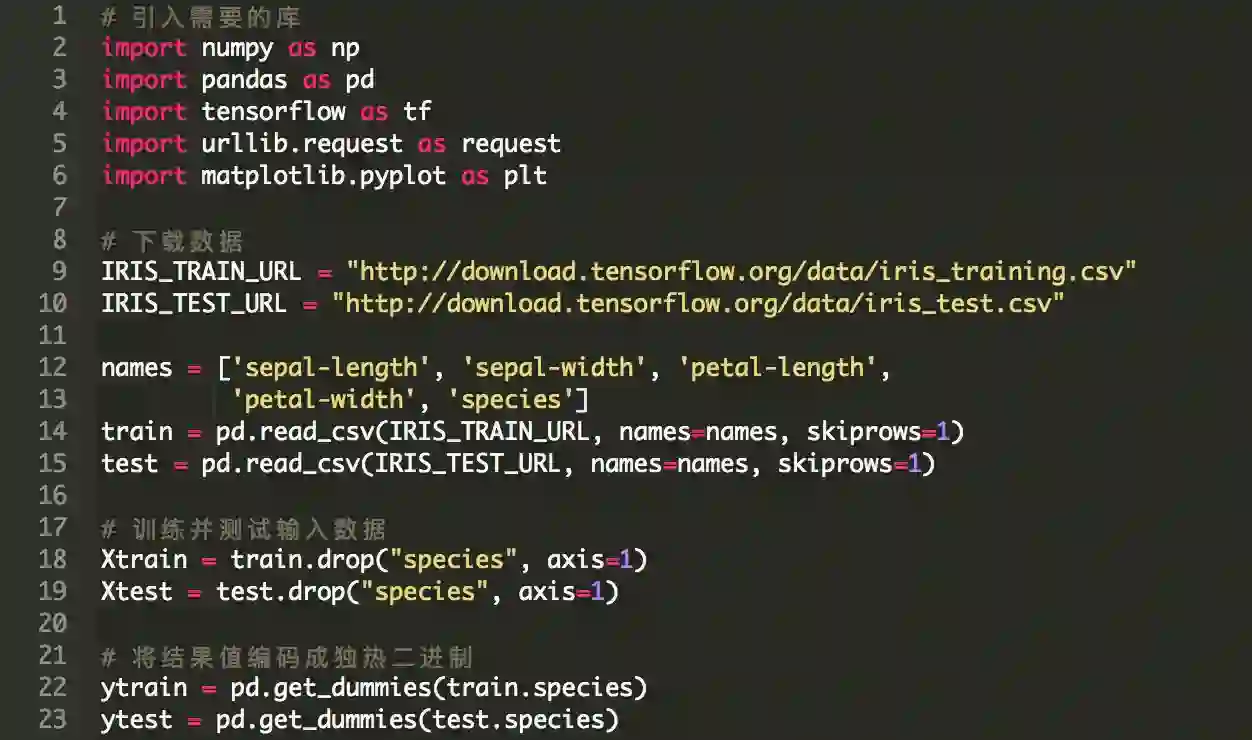 在这篇文章中,我们介绍了用于机器学习的TensorFlow库,为安装提供了简要的指导,介绍了TensorFlow底层核心应用接口的基本组件:张量,图形和会话,最后构建了一个神经网络模型来对真实数据集——Iris数据集进行分类。