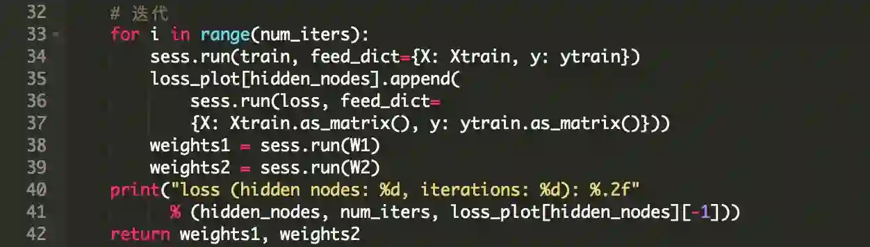下面的代码定义了一个函数,我们在这个函数中创建模型,定义一个需要最小化的损失函数,并且运行2000次迭代,来训练习得最优权重W_1和W_2。 如前所述,输入和输出矩阵被馈送到tf.placeholder张量,并且权重被表示为变量,因为它们的值在每次迭代中变化。损失函数被定义为我们预测y_est和实际物种类型y之间的平均方差,我们使用的激活函数是sigmoid。最后,由create_train_model函数返回学习权重并输出损失函数的最终值。