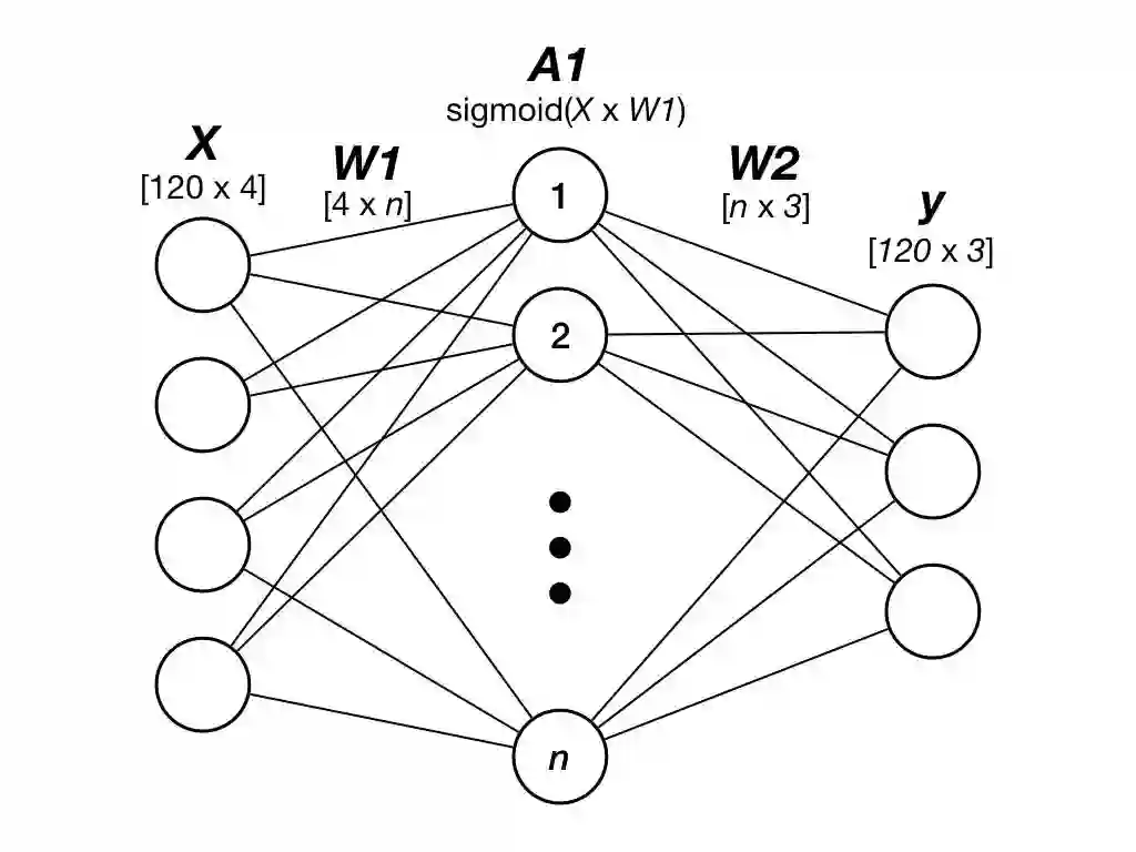我们的神经网络的输入和输出层的形状将对应于数据的形状,即输入层将包含代表四个输入特征的四个神经元,而输出层将包含三个神经元,每一个神经元存储1比特,3比特以独热的方式可以存储植物的三种类型。例如“setosa”物种可以用矢量[1,0,0]编码,“virginica”用[0,1,0]编码。