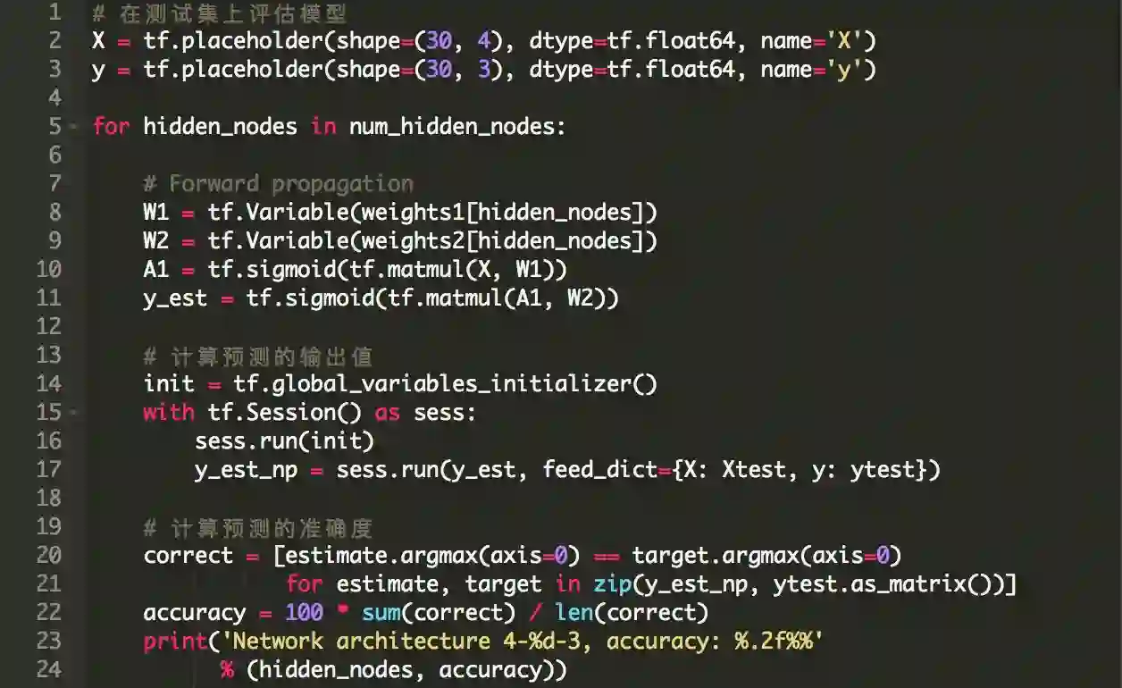 最后,让我们来评估我们的模型。我们使用学习权重W_1和W_2,将模型应用于测试集的类型的预测。准确性定义为正确预测样本的百分比。