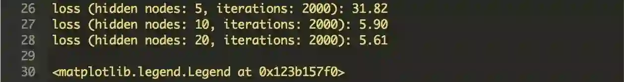 我们可以看到,具有20个隐藏神经元的网络需要更多的时间来达到最小值,这是由于其更高的复杂性。而具有5个隐藏神经元的网络陷入局部最小值,并且不会给出好的结果。