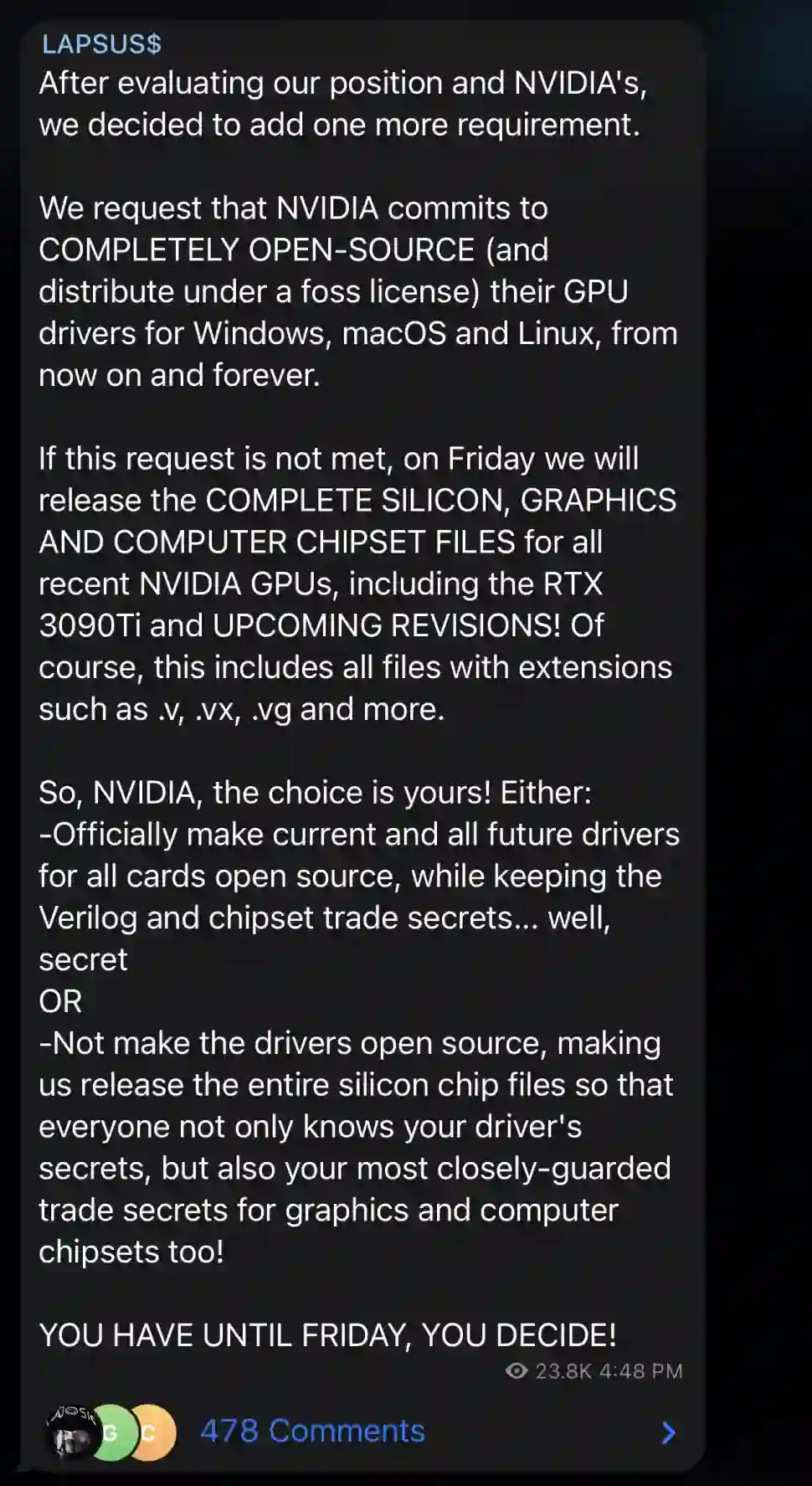 Lapsus$要求英伟达将所有已发布和未来显卡的Windows、MacOS、Linux各版本驱动在FOSS项目协议下永久全部开源。