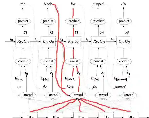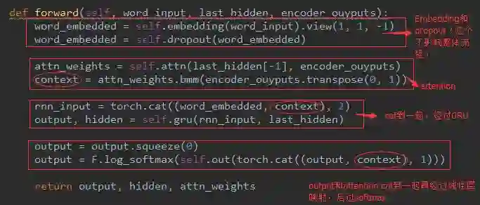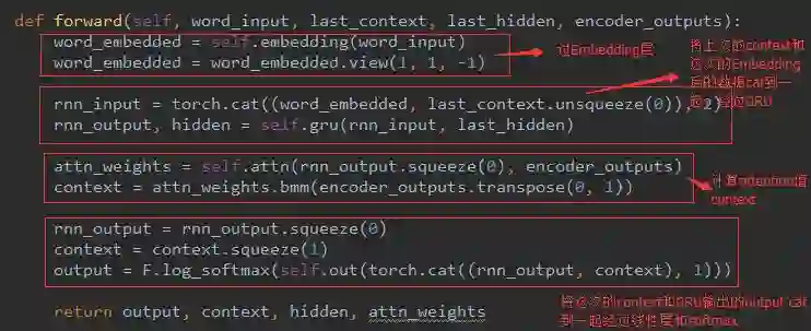 这里是用到了上一时刻的context(attention值)和上一次预测的词Embedding后cat到一起,经过GRU的。然后和上面的一样了,再计算此次的context(attention值)并和此次的GRU输出的output cat到一起经过线性层然后softmax得出预测值。