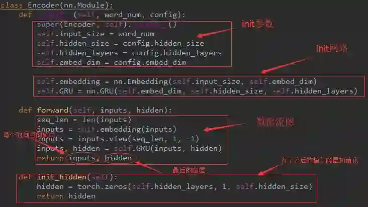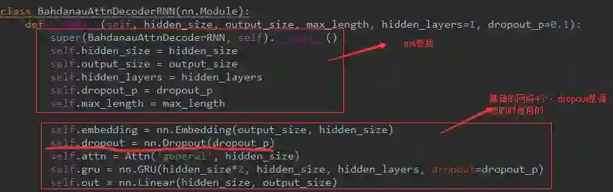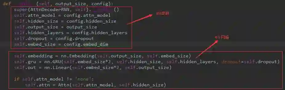 首先得需要Embedding层来完成数据输入;然后很明显需要一个GRU网络来预测词和产生接下来的隐层;而GRU由图来看得需要attention网络来评分;而GRU预测词又需要有线性层来映射到分类上,因此又多了两个网络层。总共4个网络。我们来看下代码: