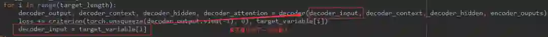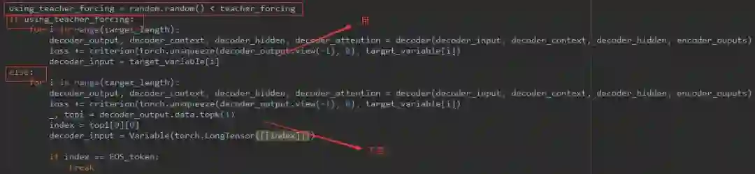 我们在Decoder预测的时候,都是用到上一次预测的结果,一般情况下,在预测的前几轮都是不正确的,也就是说前面的预测本来就不正确,后面根据前面的结果再预测就是错上加错了。所以,为了加快模型训练的速度,我们引入teacher_forcing方法。很简单,就是在前几轮不管之前预测的结果,此次要用到的前面的词为真正的target词,代码为:
