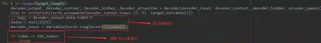 这个过程首先它的结束标志是标准预测序列的长度,但也可以是遇到结束符<EOS>。其次,我们看出这里用的loss评价指标是我们的最普通的那种和target比较得出loss,而没有用到BLEU评价算法。