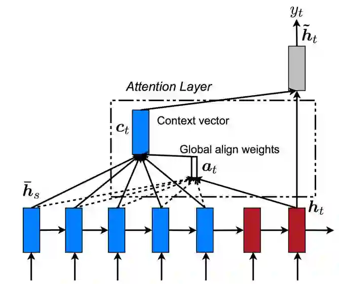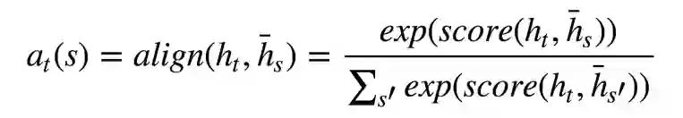 分别为:dot方法,general方法,concat方法。其中h_t是Encoder第t个output,此时的目标是预测Decoder的第t个词。h_s是Encoder的当前隐层。