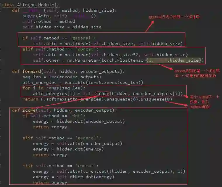如果是dot方法,只需要参数encoder_hidden和output_t即可;如果是general方法,就需要output_t经过一个线性层(因为线性层里只有个W,当然b另说,无伤大雅)和encoder_hidden dot下就行了;下面的cat方法就也很明显了,重点是哪个v_a,这个是一个参数,可以进行更新的参数,刚开始可随机初始化。无论用哪个方法,我们最后都得softmax下,算出相对的权重。