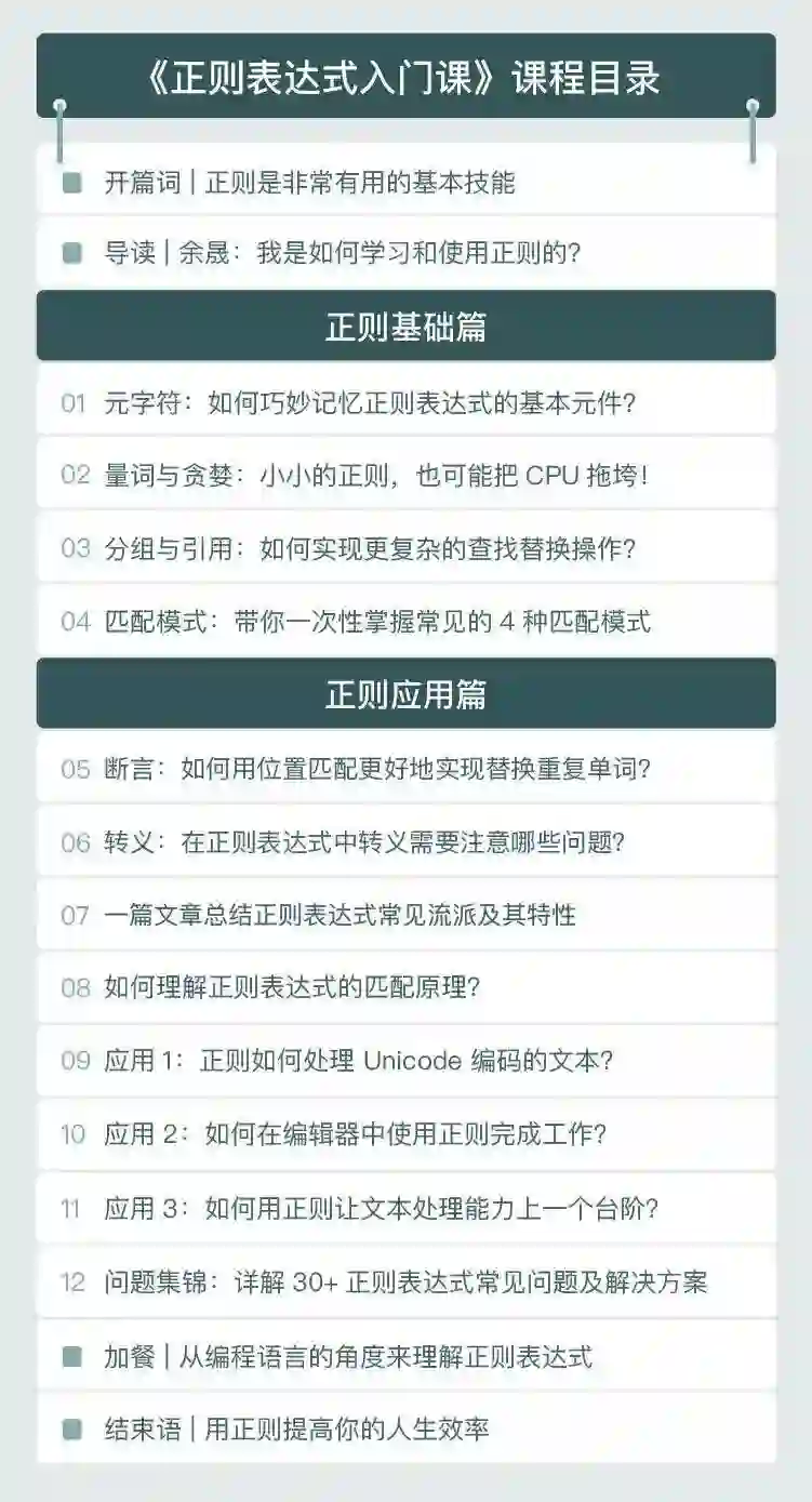 其实说起学正则,大家的核心需求基本就是要「系统」,所以我也在看了几篇文章后,给你总结下这个课怎么讲的,共两个模块:先讲正则重要的概念和功能,再以工作中的真实案例,带你实操应用。