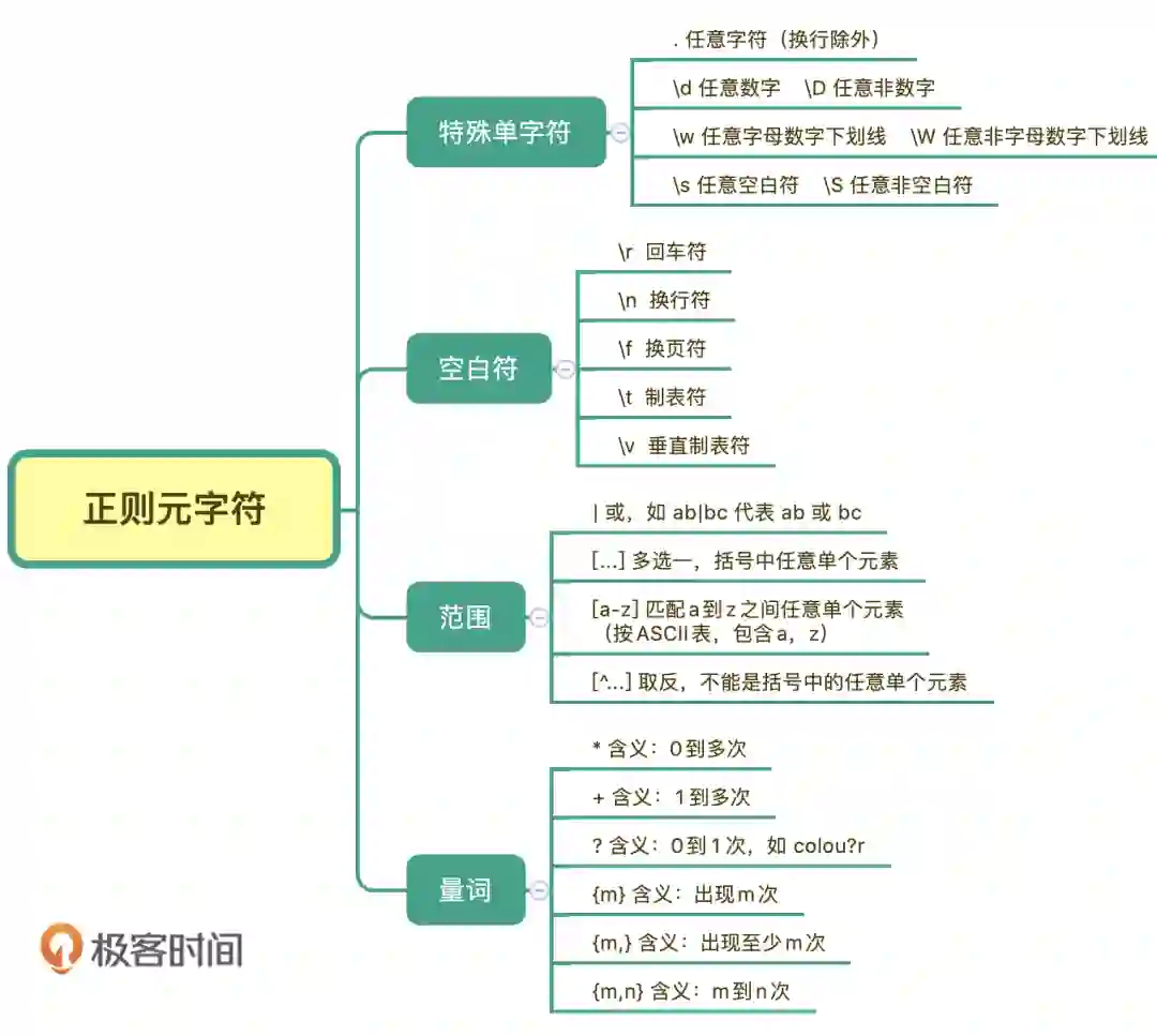 下边是他总结的正则表达式记忆脑图中的“元字符”部分,分享给你,建议收藏👇