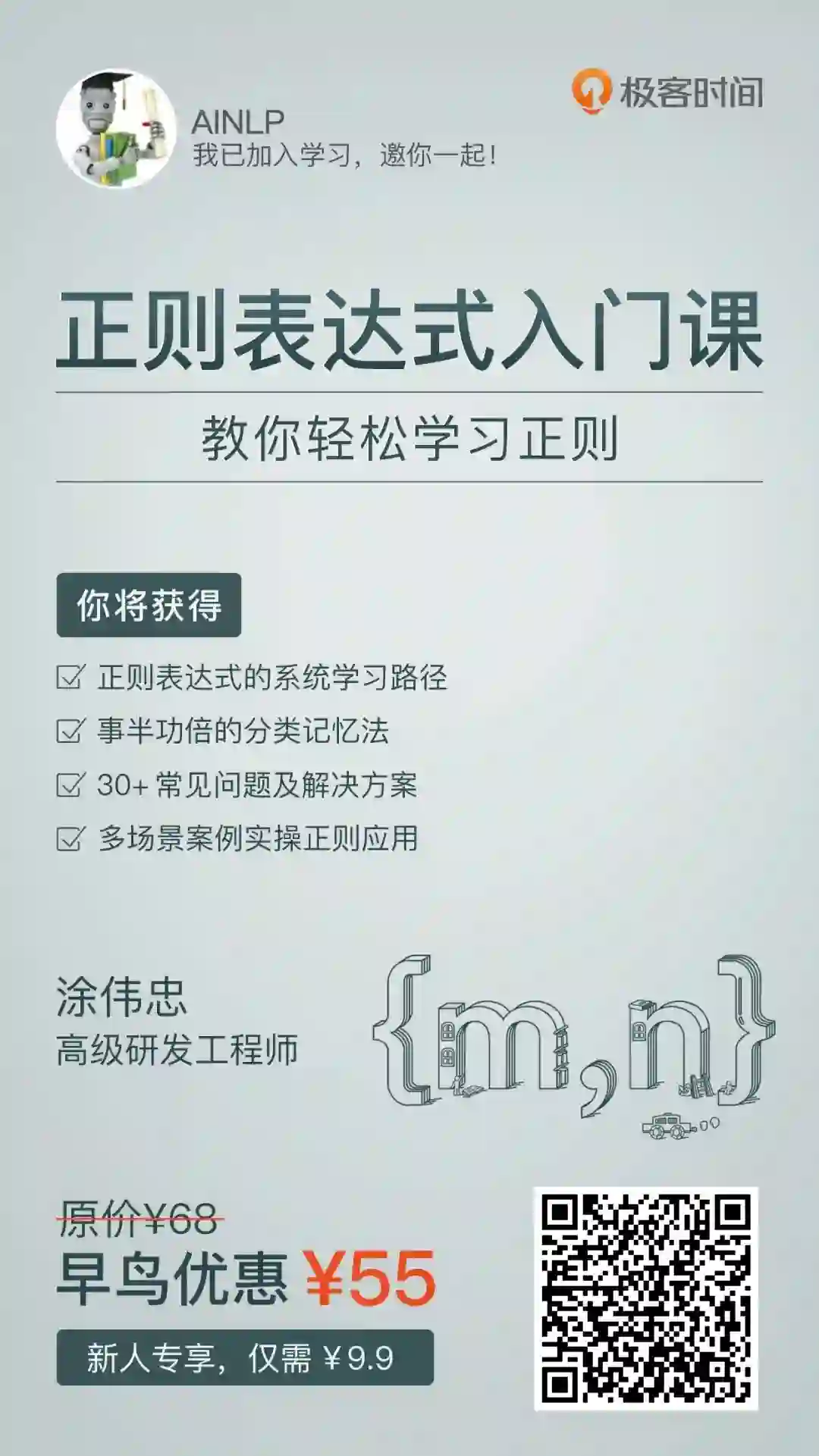 总结起来,就是没有系统学习正则、没有高效的记忆法。所以我也一直在找可以系统学正则的资料,机缘巧合,我在极客时间上看到一个涂伟忠讲解正则的「视频」,梳理得非常到位,可以先“mark”后看。