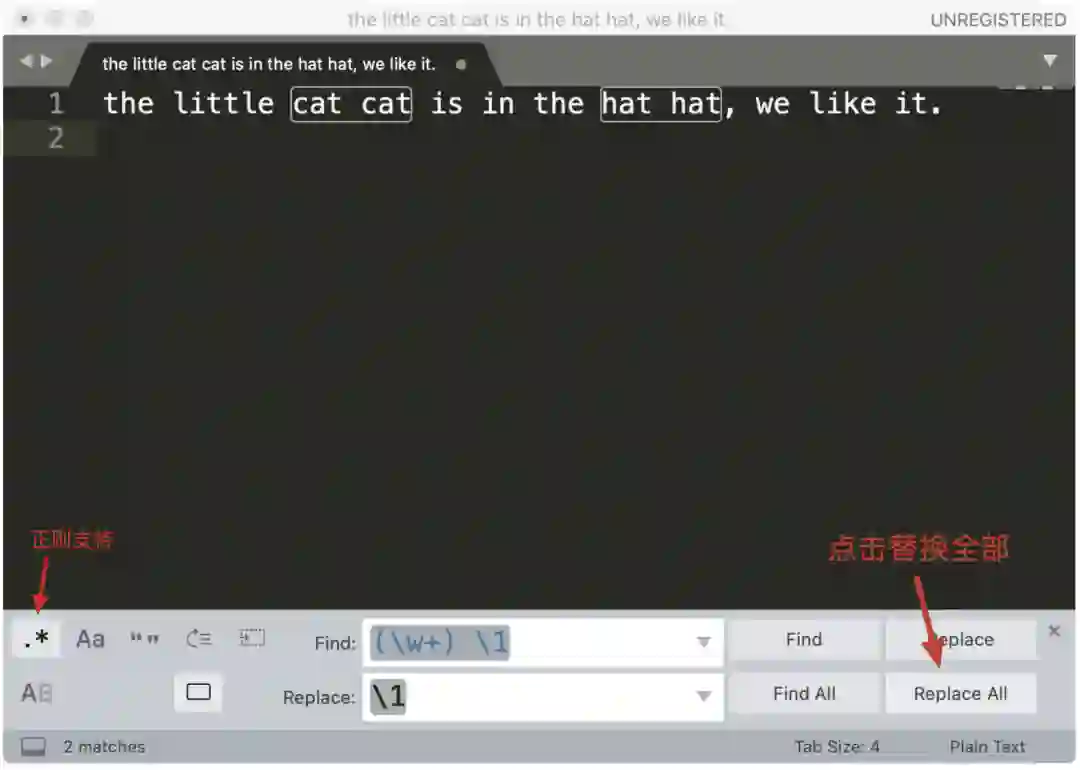 菜单中的 Find -> Replace,在查找栏中输入 (\w+) \1,在替换栏中输入子组的引用 \1 ,然后点击 Replace All 就可以完成替换工作了。这样,通过少量的正则,我们就完成了文本的处理工作了。是不是很方便呢?