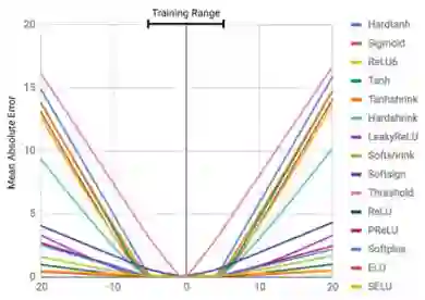 为了说明标准网络中的系统性失效,我们展示了各种MLPs 在学习标量恒等函数的表现。图1表明即使采用简单的框架,所有非线性函数都无法学习到超出训练范围外的数量表示。