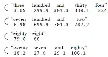 为了测试数字词语的表示是否是以系统的形式来学习,我们设计了一个新的翻译任务:将文本数字表达式(例如五百一十五) 转换为标量表示(515)。训练和测试的数字范围在0到1000之间,其中训练集、验证集和测试集的示例分别为169、200和631。在该数据集上训练的所有网络都以embedding 层开始,通过LSTM 进行编码,最后接一个NAC 或NALU。表3表明了LSTM + NAC 在训练和测试集上都表现不佳。LSTM + NALU 可以大幅度地实现最佳的泛化性能,这说明乘数对于此任务来说非常重要。这里还给出了一个NALU 测试的例子如图3所示。