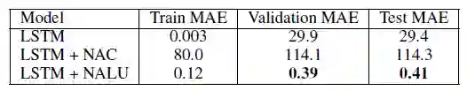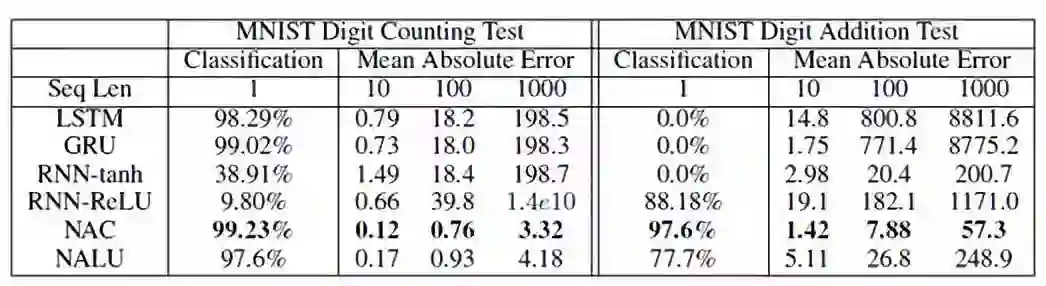 在我们的最后一项任务:MNIST 奇偶校验中,输入和输出都不是直接用数字提供的,而是隐式地对数字量进行推理。在这个实验中,NAC 或其变体取代了由Segui 等人提出的模型中的最后一个线性层。我们系统地研究了每个约束的重要性。表4总结了变体模型的性能,我们可以看到去除偏置项和运用非线性权重的方法显著提高了端到端模型的准确性,NAC 将先前最佳结果的误差减少了54%。