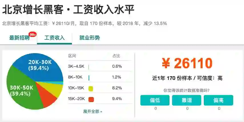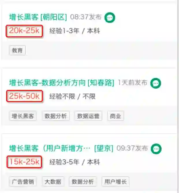 因为以上3点的出现,增长岗被市场急迫地需要着。国内顶尖公司如滴滴、今日头条等也纷纷成立了自己的增长团队,「增长岗」的价值也随之上升,这一点从薪资就可以直观体现(月薪2W已成常态):