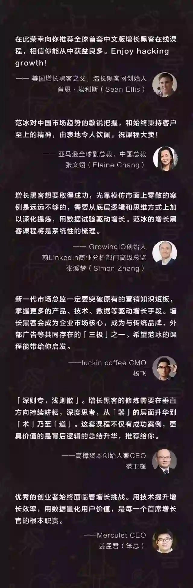 这堂课程已经得到了包括硅谷“增长黑客之父”Sean.Ellis,亚马逊全球副总裁张文翊在内的诸多业内顶级大咖的背书推荐: