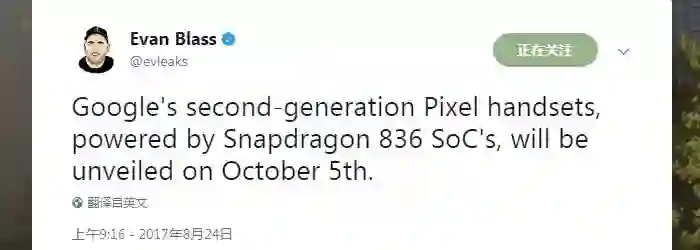 XDA 的消息显示 Pixel 2 代将搭载高通在今年上半年发表的旗舰处理器 Snapdragon 835 ,从目前已经出现采用 835 芯片的手机表现来看,应对各种日常使用和游戏性能来看,绝对是属于顶级水平。而来自 Twitter 爆料大神 @Evan Blass 在 8 月 24 日发表的消息表示 Pixel 2 代将会搭载高通 Snapdragon 836。考虑到高通尚未正式发表 836 处理器,个人猜测有可能 Pixel 2 采用 835 芯片,用来保证供货,而 Pixel XL 2 则会首发 836,凸显其最顶级的 Android 手机身份。