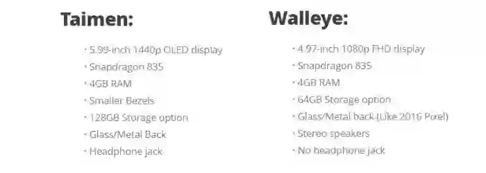 代号 Muskie 的设备曾传闻是廉价版机型,不过随着 Rick Osterloh 明确表态 Google 会在高端市场发力,媒体也佐证了剩下 Walleye 和 Taimen 两款机型,分别对应了 Pixel 2 和 Pixel XL 2。