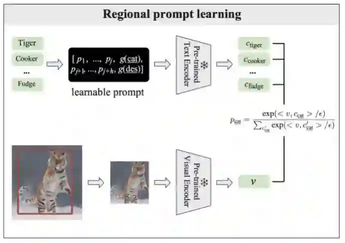 我们提出了一个简单的区域prompt学习 (RPL) 概念,引导文本潜在空间以更好地拟合以物体为中心的图像。具体来说,在计算类别分类器或嵌入时,我们将一系列可学习向量添加到文本输入中,称为“连续prompt向量”。此外,我们还在prompt模板中包含更详细的描述以减轻词汇的歧义,例如,{category: “almond”, description: “oval-shaped edible seed of the almond tree”}。因此,每个单独类别的嵌入可以生成为:
