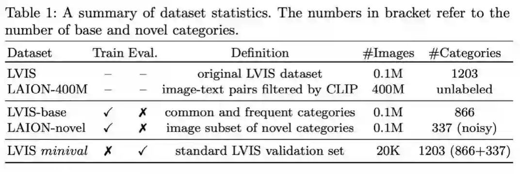 开放词汇LVIS基准使用的数据集统计如下表所示: