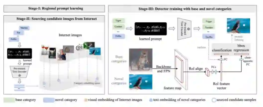 本文描述了一种将视觉潜在空间与预训练的语言编码器配对的简单想法,即继承CLIP的文本编码器作为“分类器”生成器,只训练检测器的视觉骨干和与类别无关的区域提取网络。我们方法的新颖之处在于对齐视觉和文本潜在空间的两个步骤。首先,我们提出在文本编码器端学习一定数量的prompt向量,称为区域prompt学习(简称RPL),从而可以转换其潜在空间,以更好地与以物体为中心的视觉特征配对。其次,我们通过从互联网上检索一组未经处理的候选图像来进一步迭代优化prompt向量,并在检索到的候选图像上生成伪标签,对检测器进行自训练(self-training)。我们命名这个检测器为PromptDet。在实验上,尽管候选图像中存在噪声,但这种自训练机制在开放词汇泛化方面,特别是在没有可用标注框的类别上,显示出显著的提升。