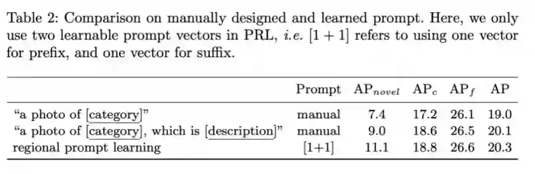 由于可学习向量与类别无关,并且为所有类别共享,因此它们可以在训练后迁移到新类别。我们从LVIS中获取基本类别的物体裁剪区域,相应地调整它们的大小,并通过冻结的CLIP视觉编码器生成图像嵌入,使用标准的交叉熵损失对这些图像嵌入进行分类。为了优化prompt向量,我们将视觉和文本编码器都冻结,只更新可学习的prompt向量。