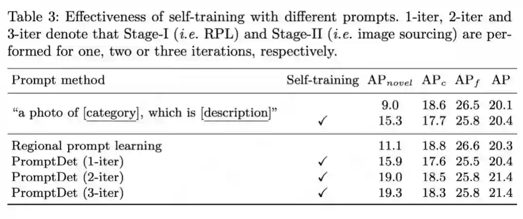 Iterative prompt learning and image sourcing: 我们迭代区域prompt学习的过程,然后以高精度检索图像。实验表明,这种迭代程序有利于以高精度挖掘以物体为中心的图像,它能够生成更准确的伪标签,因此在自训练后大大提高新类别的检测性能。