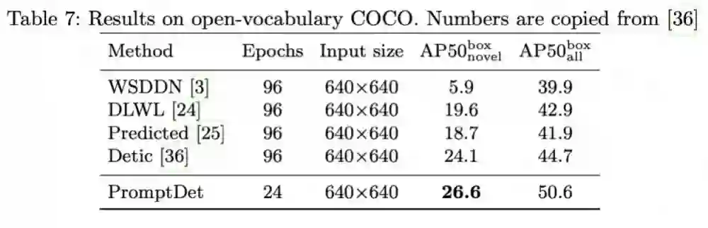 开放词汇COCO基准目标检测结果。训练了24个epoch的PromptDet在新类别mAP(26.6 AP 对 24.1 AP)和整体 mAP(50.6 AP 对 44.7 AP)上都优于Detic。