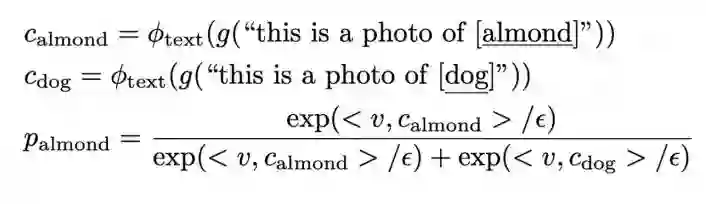 Open-vocabulary classification( ):旨在对固定大小词汇之外的视觉对象进行分类。我们假设视觉和自然语言之间存在一个共同的潜在空间,我们可以在语言潜在空间中寻找其最接近的嵌入来对任何视觉对象进行分类,例如,将区域特征分类为“almond”或“dog”,可以计算出“almond”的分类概率: