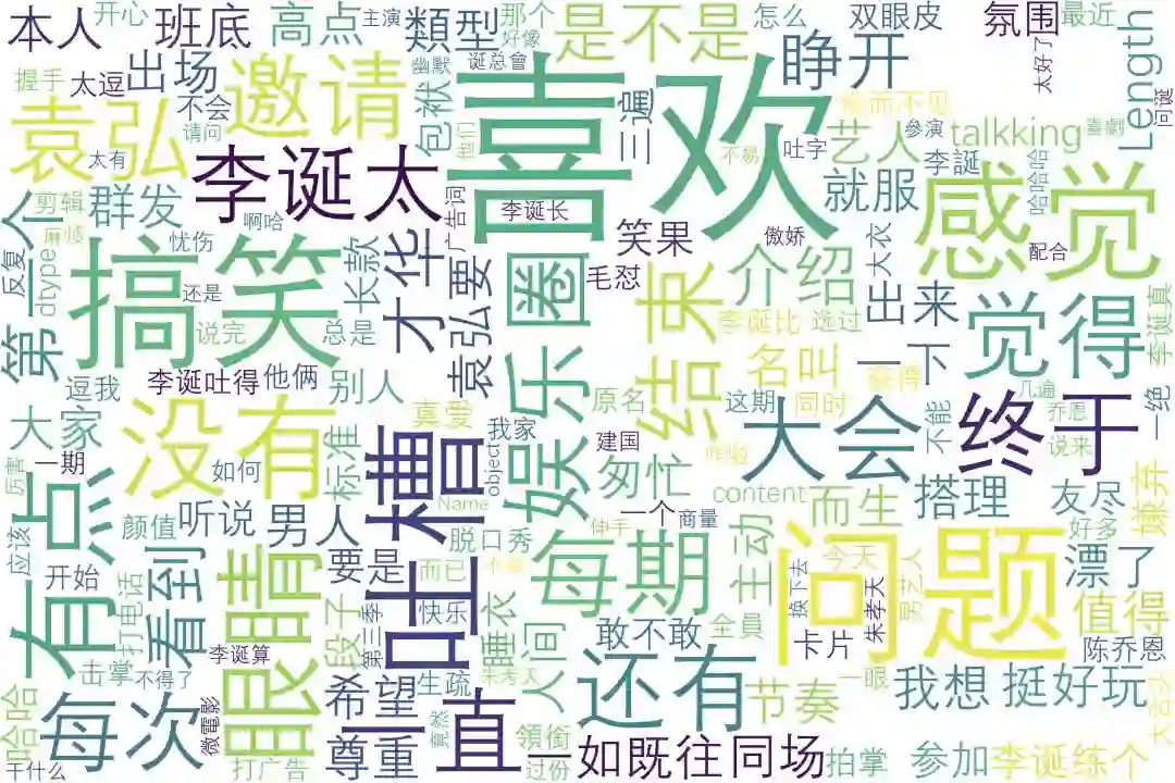 没有想到的是,在这 18w 的数据中,居然只有 8000 多条数据。毕竟同样是每一期人员都非常多的综艺节目,在《奇葩说》5w 多条数据中就有 1w 多条与李诞相关,但结果到李诞成名的《吐槽大会》上却远远不足,值得我们思考。