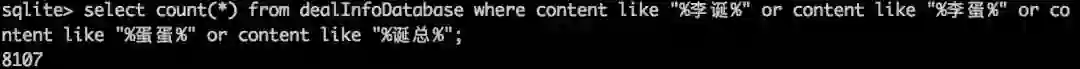 select count(*) from dealInfoDatabase where content like "%李诞%" or content like "%李蛋%" or content like "%蛋蛋%" or content like "%诞总%";