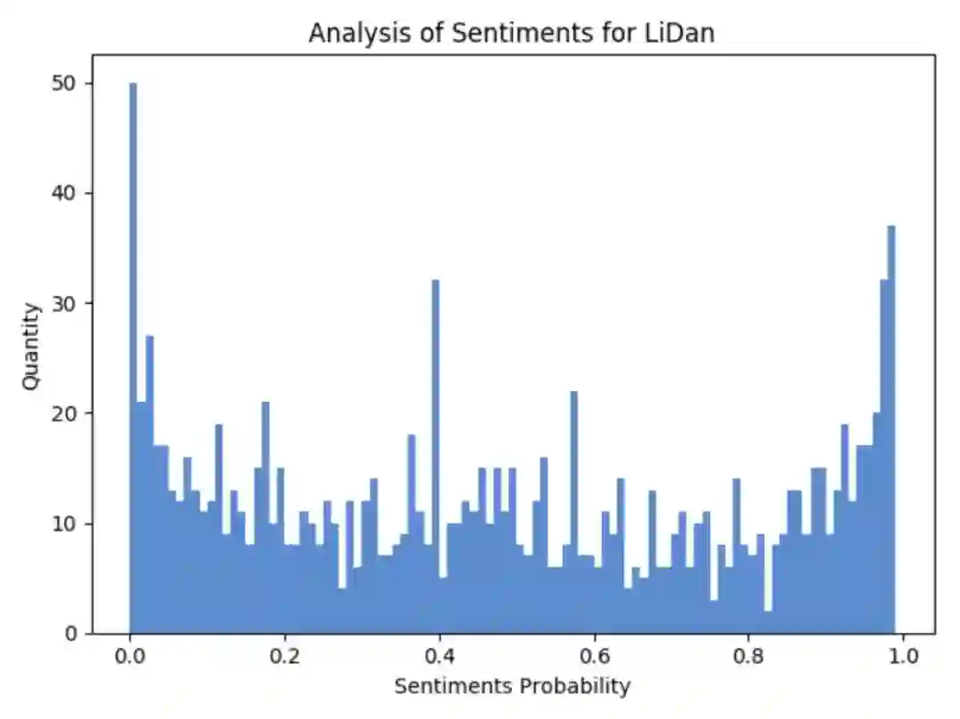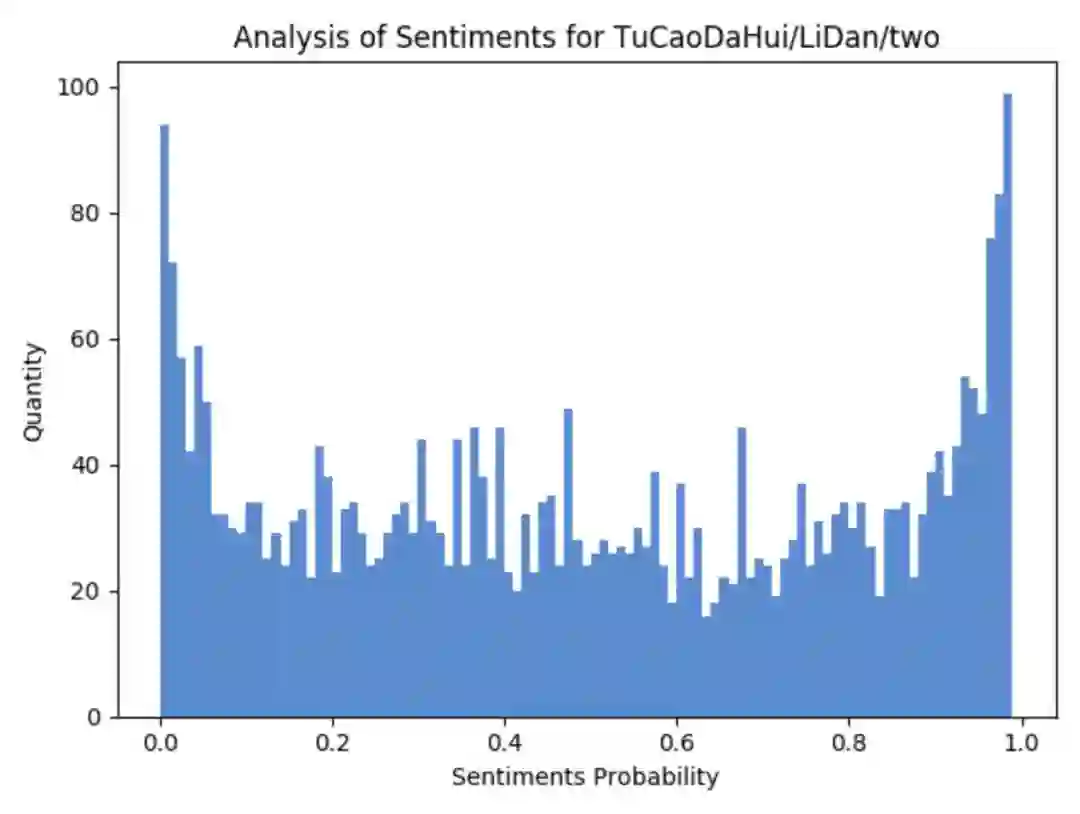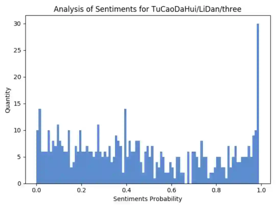 好多人都说李诞是在被人骂,所以笔者在此对评论中包含李诞的数据进行了过滤(作者注:这样来看不一定准确,但也能从一个角度来看大体的数据情况),做了一下情感分析,先看图: