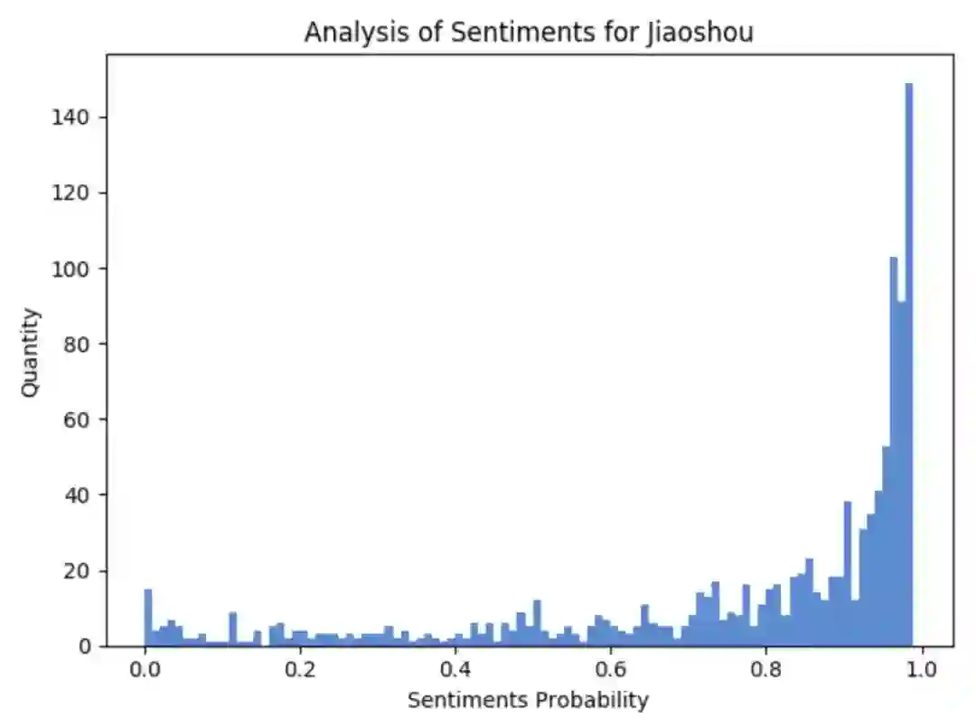 首先来看一下,全部评论数据的整体情感分析,可以看到,整体的正向情感要多于负向情感。