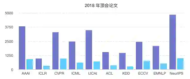 这部分将介绍部分学术会议的论文主题分布情况,包括 ICML 2018、NeurIPS 2018、AAAI 2018、IJCAI 2018 和 ACL 2018。
