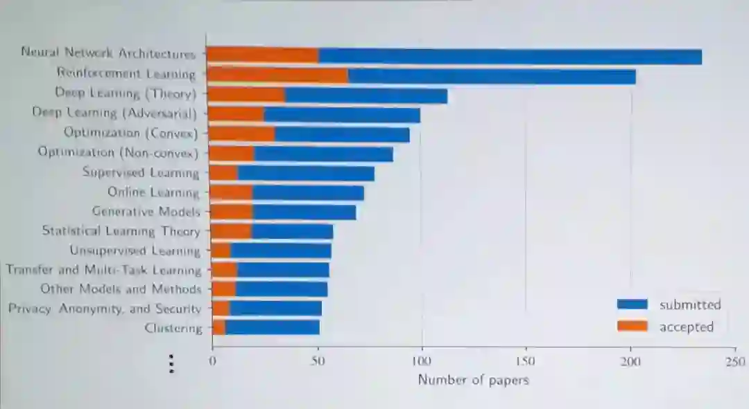 下图展示了 ICML 2018 论文子领域统计情况。可以看出神经网络架构和强化学习两个子领域的投稿数量最多,强化学习领域的论文接收数量最多,其它热门方向还有深度学习理论、最优化方法、监督学习、在线学习、统计学习理论等等。