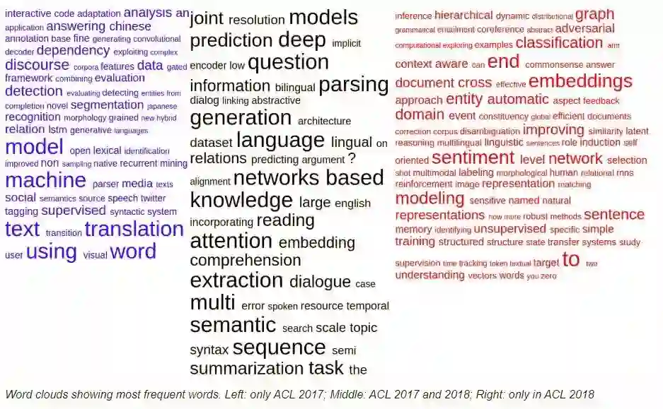 接收论文标题关键词(左:ACL 2017 独有,中:ACL 2017 和 ACL 2018 共有,右:ACL 2018 独有)(图源:https://www.msra.cn/zh-cn/news/features/acl-2018)