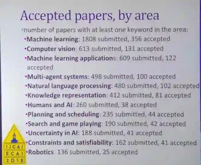 IJCAI 2018 共收到 3470 篇论文投稿,最终录取 710 篇。其中机器学习论文在论文提交和接收量上都是第一,分别是 1808 篇和 356 篇。紧随其后的子领域有:计算机视觉、机器学习应用、多智能体系统、自然语言处理、知识表征等。