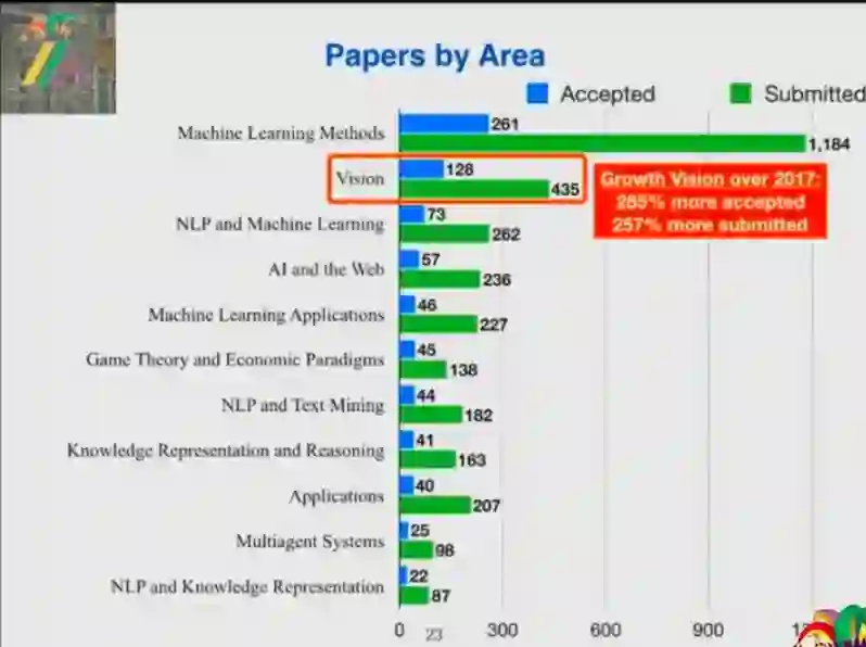 AAAI 2018 收到的投递论文有 3808 篇,接收论文 938 篇。其中机器学习方法的论文在论文提交和接收量上都居首位,而视觉领域的论文稳居第二,且相比 2017 年该领域论文提交量增长了 257%、接收数量增长了 285%,实现了飞跃。紧随其后的是 NLP 与机器学习、AI 与网络、机器学习应用等。