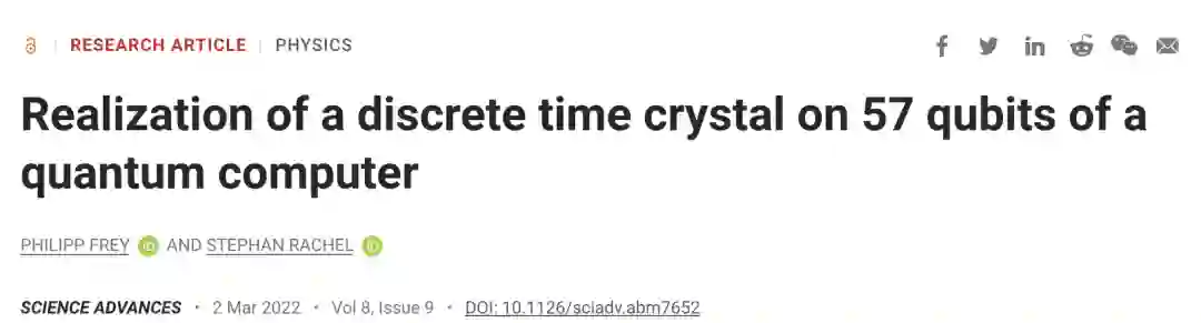 目前,最新研究Realization of a discrete time crystal on 57 qubits of a quantum computer在3月2日发表在Science Advaces。