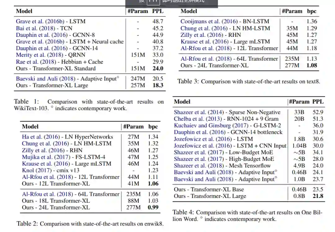 作者在语言模型任务上将Transformer-XL和其他state-of-art的模型进行对比,效果拔群。其中One Billion Word数据集中不包含长时文本的依赖,可以看到效果也是相当好的。