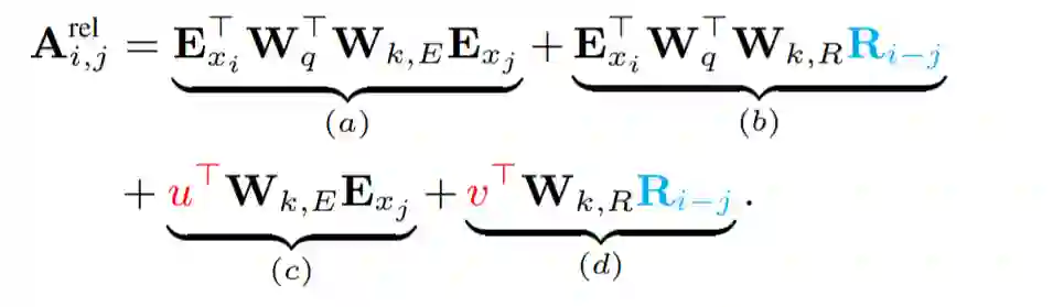 运用相对位置编码的思想,我们首先会把(b)项和(d)项中的Uj替换成相对的位置编码Ri-j。这样的改变可以让原本与j的绝对位置有关的编码部分转为了只与两者之间的相对位置有关,这个相对位置编码和原来的绝对位置编码一样也是不可学习的,只与i-j有关。另外将原来在(c)项和(d)项中一样的Wk,变成了与Embedding对应的Wk,E 以及与位置编码对应的Wk,R。最后,作者引入了两个可学习的变量u和v,用以替代(c)项和(d)项中的绝对位置编码和query矩阵的乘积,因为在这里乘得的query相关向量应该与绝对位置无关。