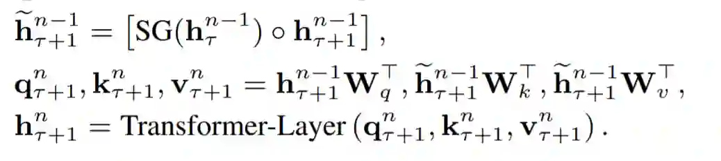 最后,结合循环机制和相对位置编码,Transformer-XL一层的完整公式如下所示: