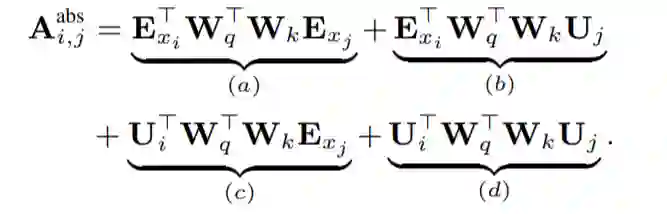 经过了这样的替换,作者认为,每一项都有了一个具体含义,(a)项是content based addressing,也即主要是基于内容的寻址。(b)项是content dependent positional bias ,和内容相关的位置编码偏置。(c)项是global content bias ,全局的内容偏置。(d)项是global positional bias,全局的位置偏置。